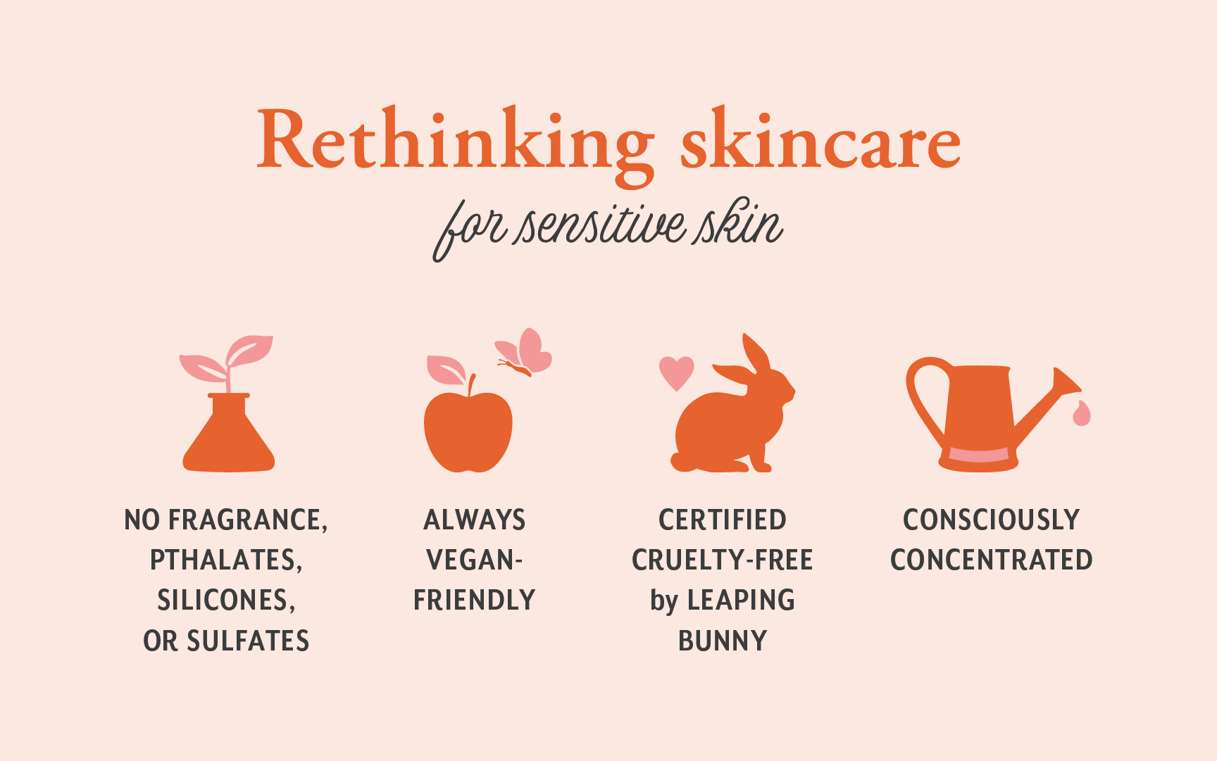 We specifically design our products to be safe for sensitive skin. That means that all of our products are fragrance-free as well as free of any common allergens. We choose to leave out all essential oils in addition to all synthetic fragrances to limit reactivity. Our guiding principle is to keep our formulations as simple as possible and to use the best ingredients we can source to keep things safe for sensitive skin. Having said that, we still always recommend patch testing our products and going slowly.